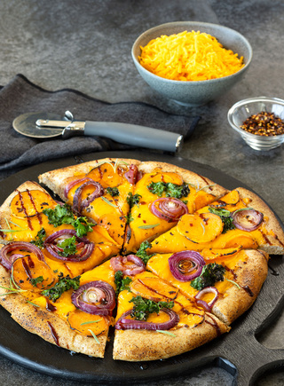 Cracker Barrel Cheddar Pizza with Sweet Potato & Kale