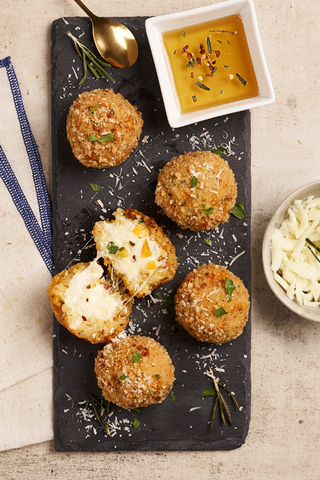To serve, drizzle arancini with 1/3 cup warmed honey, or serve honey as a dipping sauce. (For added spice, add reserved red pepper flakes to honey to taste.)