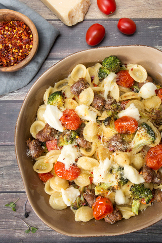 Toss pasta with broccoli mixture, butter, and ½ cup reserved pasta water. Add to pan with sausage and toss on high heat for 1 minute. (Add more water if pasta seems dry.)